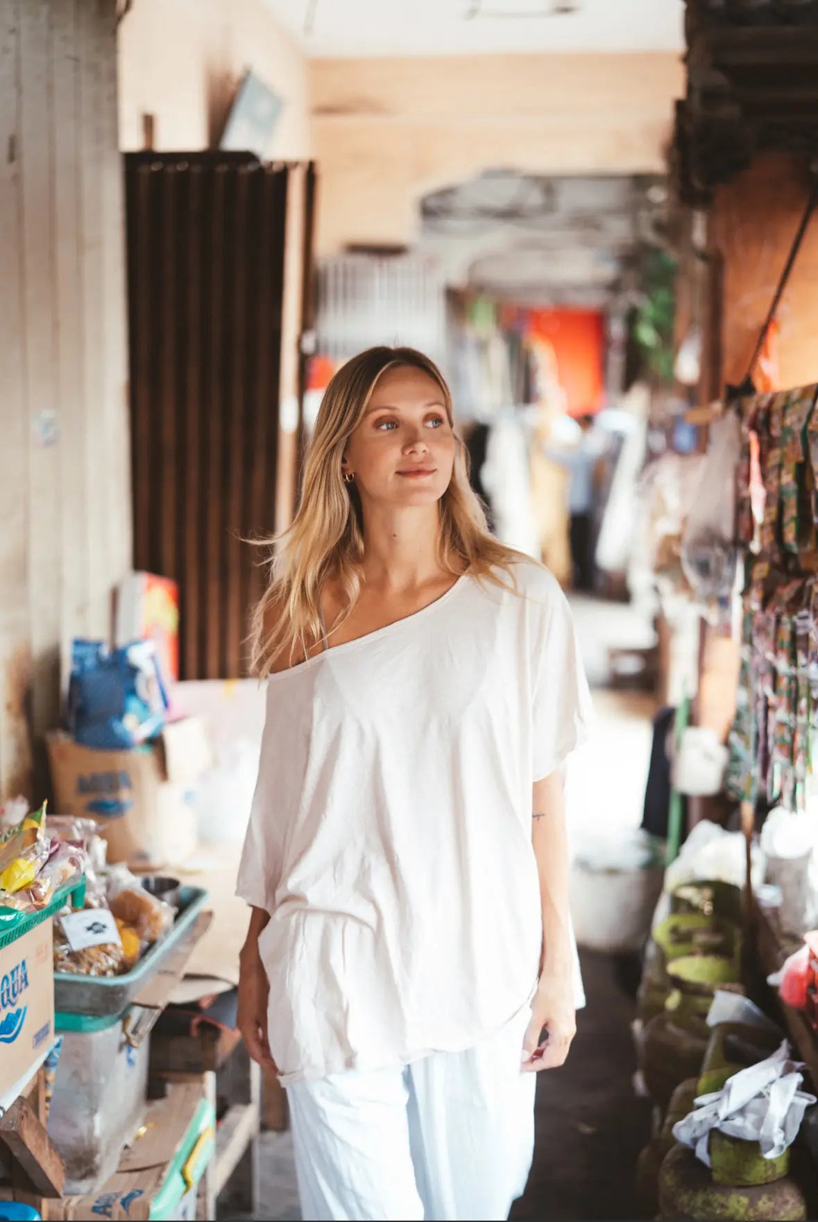 Siliana is an oversized tee with a wide round neckline and drop-shoulder sleeves. It is ideal to be worn as a layering piece or off the shoulder.